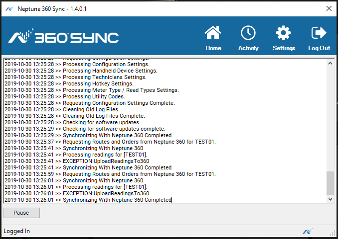 The Activity window shows the reading and synchronization activity logged for Neptune 360 Sync. If you are having any issues, copy the activity that is tracked on this window and email it in a support request to support@neptunetg.com.